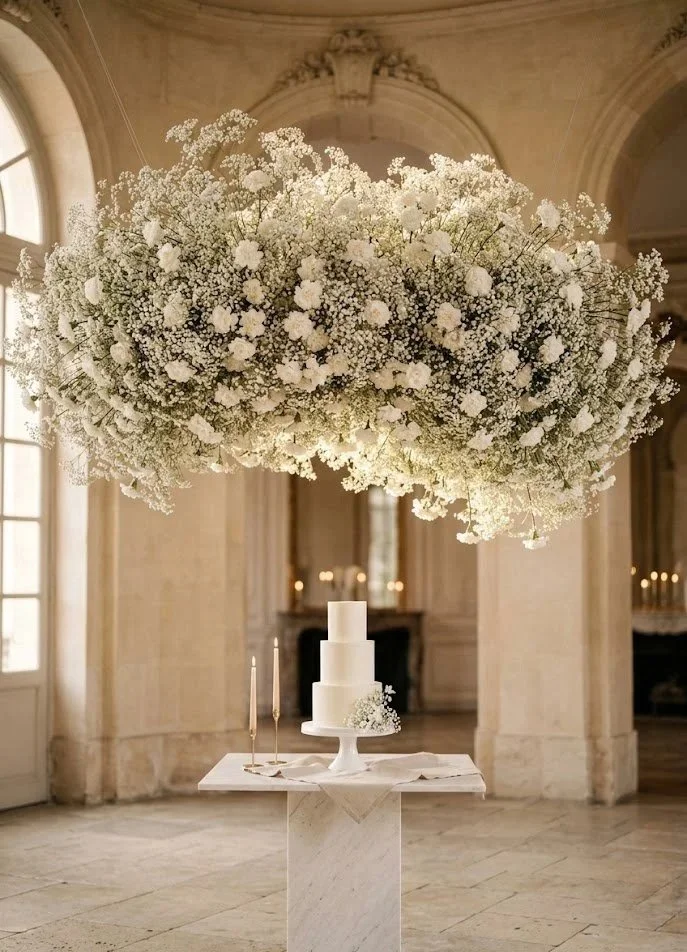The Project: Create a "Floral Cloud" over your cake table or bar using only Baby’s Breath or White Carnations.