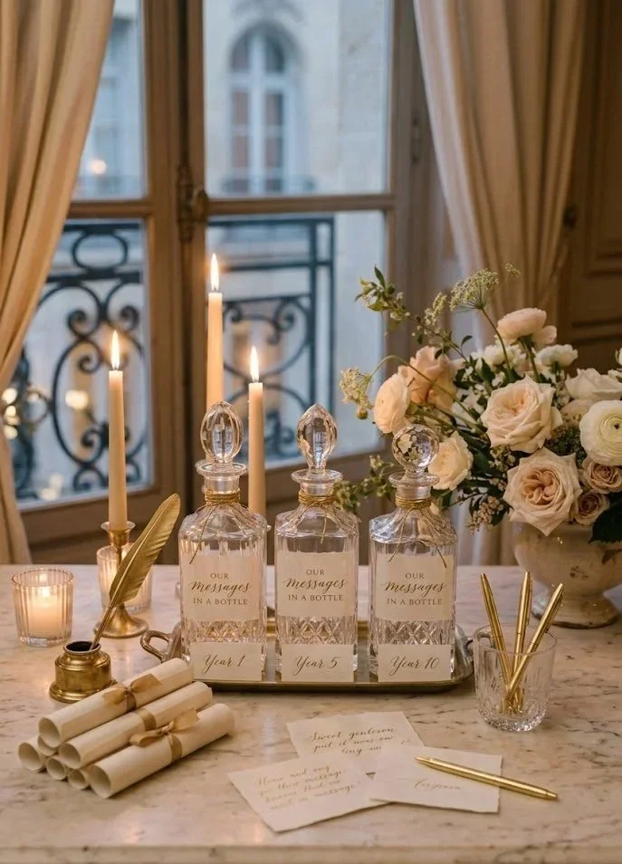The Activity: Set out three beautiful glass carafes or vintage-style bottles labeled "Year 1," "Year 5," and "Year 10." Provide small slips of parchment paper and gold pens.